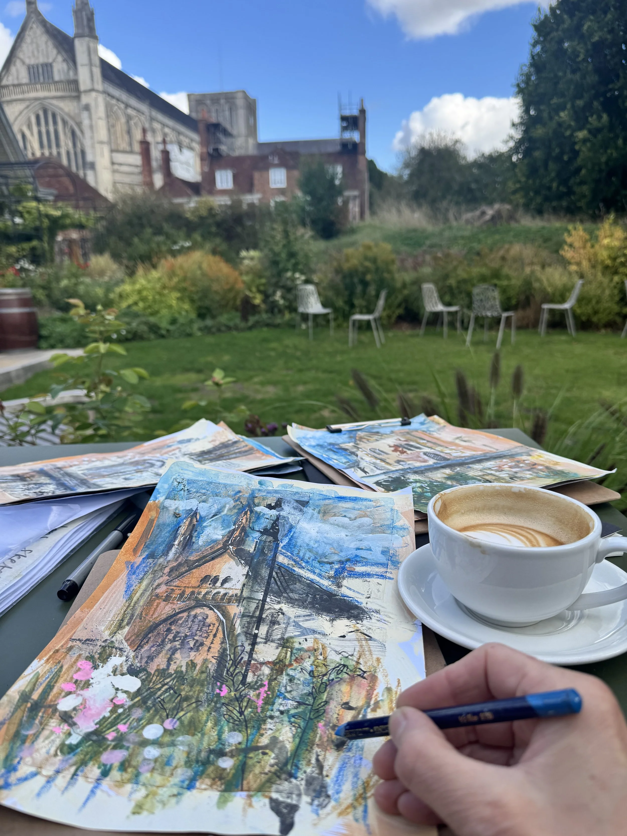 On this joyful 3-week art course Jenny will lead you through a series of doable and fun techniques for capturing the environment around us. Weather permitting we will spend some time out and about capturing and recording in our sketchbooks fun locations in Winchester. From city centre cafes and shops to the catherdral grounds and other picturesque locations within the city walls. There will be tons of exciting art materials available straight from the artists studio, from acrylics, inks, pastels to collage, gilding, printing & much more.